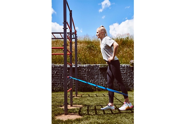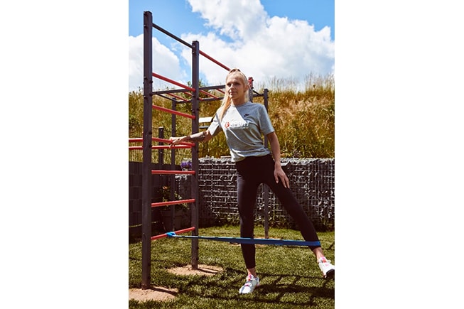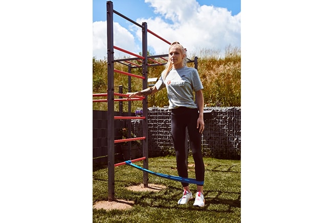 Wir starten mit dem Widerstandsband und den Extension für dein Gesäß. Wickel hierfür das Band zum Beispiel bei der Sprossenwand um die zweite Sprosse von unten. Ein Fuß geht durch die entstandene Schlinge, dein anderes Bein bildet leicht gebeugt das Standbein. Aus dieser Position startest du die Wiederholungen. Aus der Hüfte raus streckst du dein Bein, welches sich in der Schlinge befindet mit Spannung nach hinten.