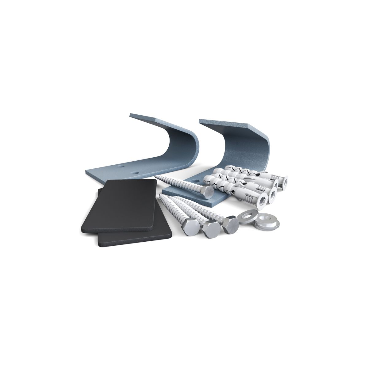 Además de los ganchos de montaje, se incluyen 4 pernos, 4 tornillos de fijación, 2 placas de fijación y 2 gomas de estabilización en el paquete.