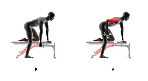 - Houd een dumbbell in één hand en plaats de andere hand en het tegenovergestelde knie op de bank.